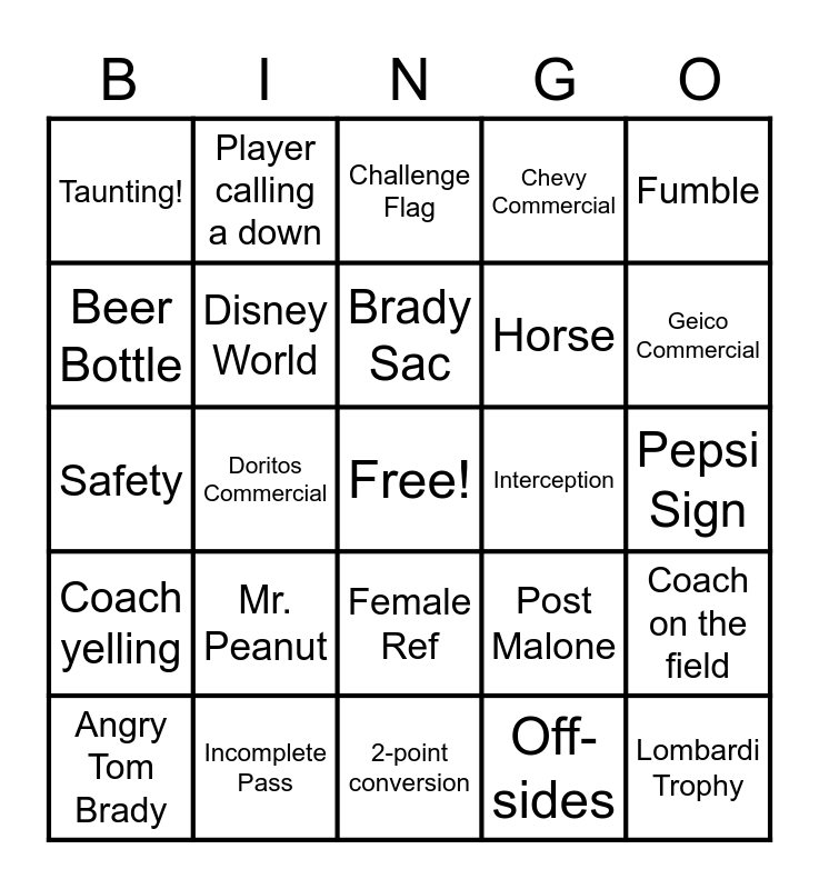 This bingo card has a free space and 29 words: Angry Tom Brady, Cheerleader, Doritos Commercial, Touchdown Dance, Taunting!, Challenge Flag, Disney World, Mr. Peanut, Interception, Incomplete Pass, Pepsi Sign, Lombardi Trophy, 2-point conversion, Off-sides, Geico Commercial, Missed Field Goal, Female Ref, Coach yelling, Fumble, Safety, Post Malone, Dog, Horse, Beer Bottle, Chevy Commercial, Player calling a down, Coach on the field, Brady Sac and Special Pizza Offer.