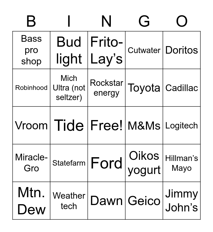 This bingo card has a free space and 32 words: Geico, Wayne’s world, Tide, Cheetos, Miracle-Gro, Mich Ultra (not seltzer), Doritos, Hillman’s Mayo, Bud light, Mich Ultra Seltzer, Rockstar energy, Frito-Lay’s, Stella Artois, Chipotle, M&Ms, Pringles, Mtn. Dew, Vroom, Ford, Statefarm, Oikos yogurt, Turbo tax, Logitech, Weather tech, Jimmy John’s, Cutwater, Toyota, Robinhood, Bass pro shop, Dawn, Guinness and Cadillac.