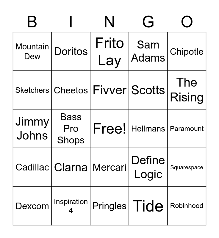 This bingo card has a free space and 33 words: Amazon, M&M, Bass Pro Shops, Bud Light, Cadillac, Cheetos, Chipotle, Dexcom, Doritos, Dr. Squatch, Fivver, Frito Lay, General Motors, Super Bowl, Hellmans, The Rising, Inspiration 4, Jimmy Johns, Clarna, Define Logic, Mercari, Michelobe, Mountain Dew, Paramount, Pringles, Robinhood, Sam Adams, Scotts, Sketchers, Squarespace, Stella Artois, Tide and Uber Eats.