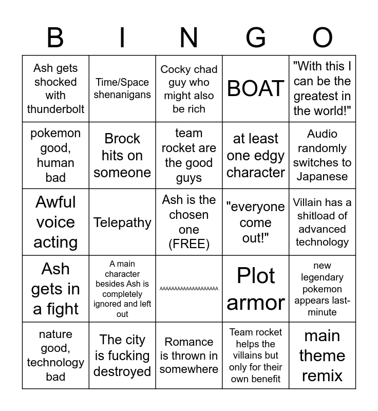 This bingo card has a free space and 39 words: something magical that stops wars (i.e. a song), Thunderbolt fixes everything, New girl character who is never seen after the movie, Brock hits on someone, nature good, technology bad, AAAAAAAAAAAAAAAAAAAA, team rocket are the good guys, Ash fucking dies, "With this I can be the greatest in the world!", Ash gets in a fight, Telepathy, BOAT, main theme remix, Villain has a shitload of advanced technology, "everyone come out!", A main character besides Ash is completely ignored and left out, a villain with no clear drive or goal, Ash gets shocked with thunderbolt, something at the beginning of the movie becomes important in the end, Plot armor, pokemon good, human bad, Romance is thrown in somewhere, at least one edgy character, Audio randomly switches to Japanese, A pun or gag ruins a moment, Ash drops a vital object, Deus ex machina, 4th wall is broken, LORE, Time/Space shenanigans, Ash rides the legendary pokemon, Character has a life-threatening fall and lives, Cocky chad guy who might also be rich, The city is fucking destroyed, Team rocket helps the villains but only for their own benefit, Dated/ugly CGI, new legendary pokemon appears last-minute, Awful voice acting and Mcguffin moment.