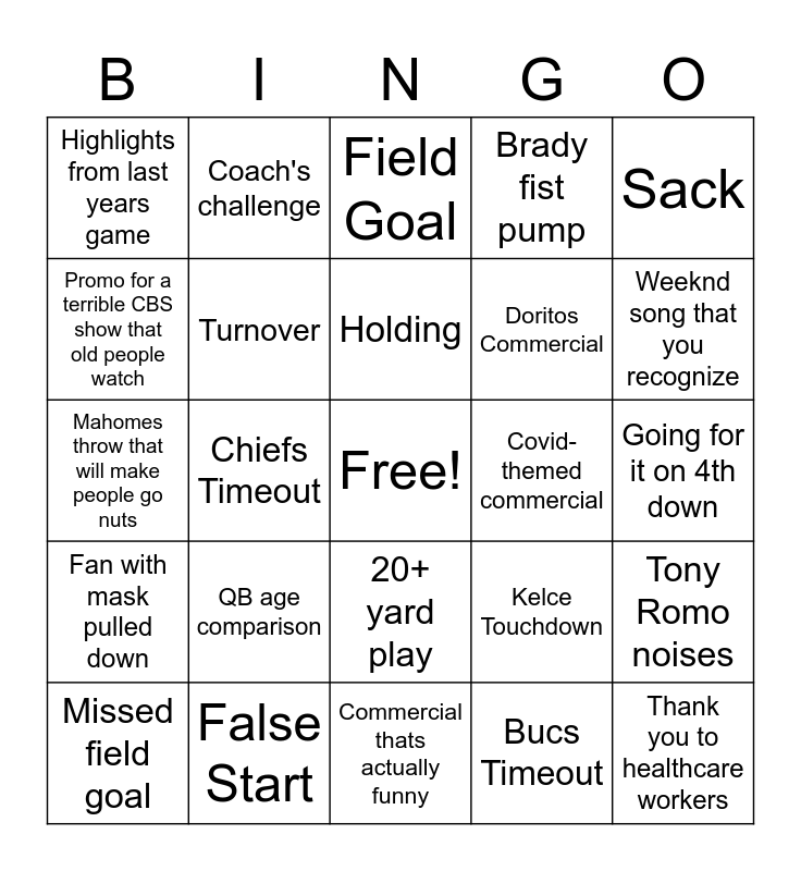 This bingo card has a free space and 27 words: Kelce Touchdown, Fournette Touchdown, Doritos Commercial, Commercial thats actually funny, Promo for a terrible CBS show that old people watch, Field Goal, Coach's challenge, Fan with mask pulled down, Covid-themed commercial, Tony Romo noises, Mahomes throw that will make people go nuts, Brady fist pump, Missed field goal, False Start, Weeknd song that you recognize, Mountain Dew commercial, Turnover, Holding, QB age comparison, Highlights from last years game, Going for it on 4th down, Bucs Timeout, Chiefs Timeout, Thank you to healthcare workers, 20+ yard play, Sack and Rules Analyst weighs in.