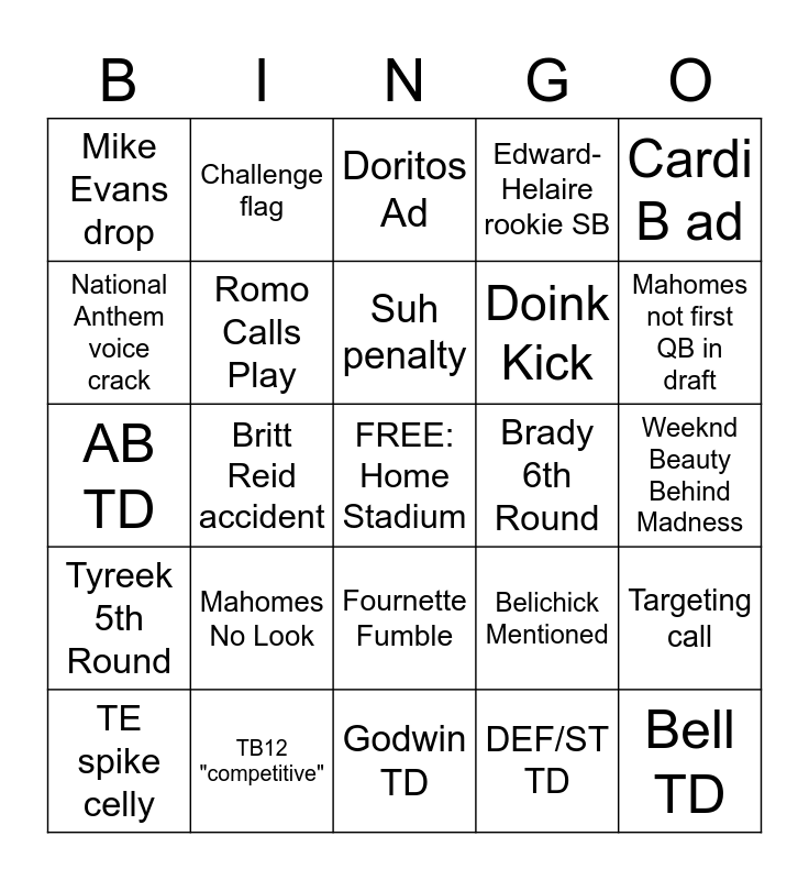This bingo card has a free space and 24 words: Mahomes No Look, TB12 "competitive", Suh penalty, TE spike celly, Cardi B ad, Mike Evans drop, National Anthem voice crack, Challenge flag, Brady 6th Round, Fournette Fumble, Doink Kick, AB TD, Belichick Mentioned, Targeting call, Romo Calls Play, DEF/ST TD, Weeknd Beauty Behind Madness, Doritos Ad, Mahomes not first QB in draft, Britt Reid accident, Bell TD, Tyreek 5th Round, Edward-Helaire rookie SB and Godwin TD.