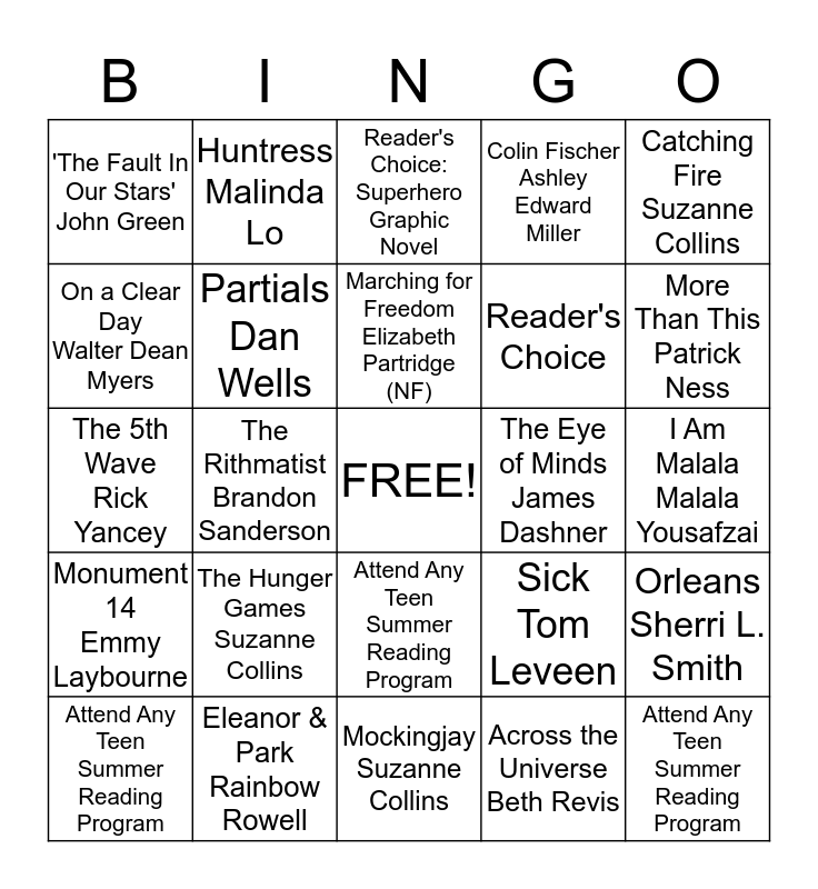 This bingo card has a free space and 24 words: The Hunger Games Suzanne Collins, Eleanor & Park Rainbow Rowell, Marching for Freedom Elizabeth Partridge (NF), Attend Any Teen Summer Reading Program, Catching Fire Suzanne Collins, 'The Fault In Our Stars' John Green, On a Clear Day Walter Dean Myers, Huntress Malinda Lo, The Eye of Minds James Dashner, Attend Any Teen Summer Reading Program, Reader's Choice, The 5th Wave Rick Yancey, Sick Tom Leveen, Orleans Sherri L. Smith, Partials Dan Wells, Across the Universe Beth Revis, I Am Malala Malala Yousafzai, Reader's Choice: Superhero Graphic Novel, More Than This Patrick Ness, The Rithmatist Brandon Sanderson, Attend Any Teen Summer Reading Program, Monument 14 Emmy Laybourne, Colin Fischer Ashley Edward Miller and Mockingjay Suzanne Collins.