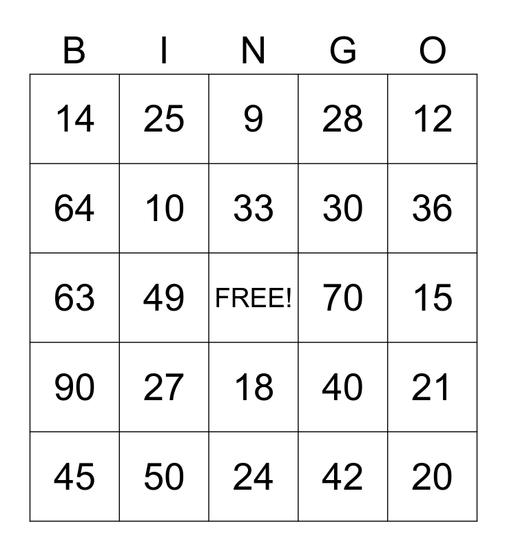 This bingo card has a free space and 24 words: 27, 50, 33, 45, 12, 14, 64, 25, 70, 18, 30, 63, 40, 21, 10, 42, 15, 9, 36, 49, 20, 90, 28 and 24.