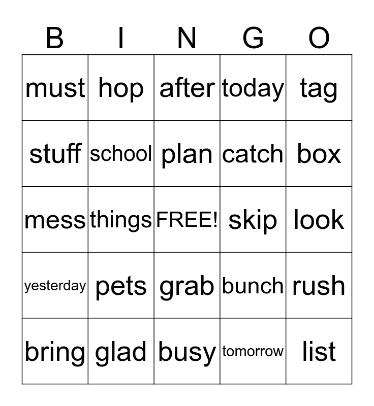 This bingo card has a free space and 25 words: pets, busy, plan, bring, tag, must, stuff, hop, skip, grab, catch, mess, bunch, rush, school, get, look, after, box, things, list, glad, yesterday, today and tomorrow.