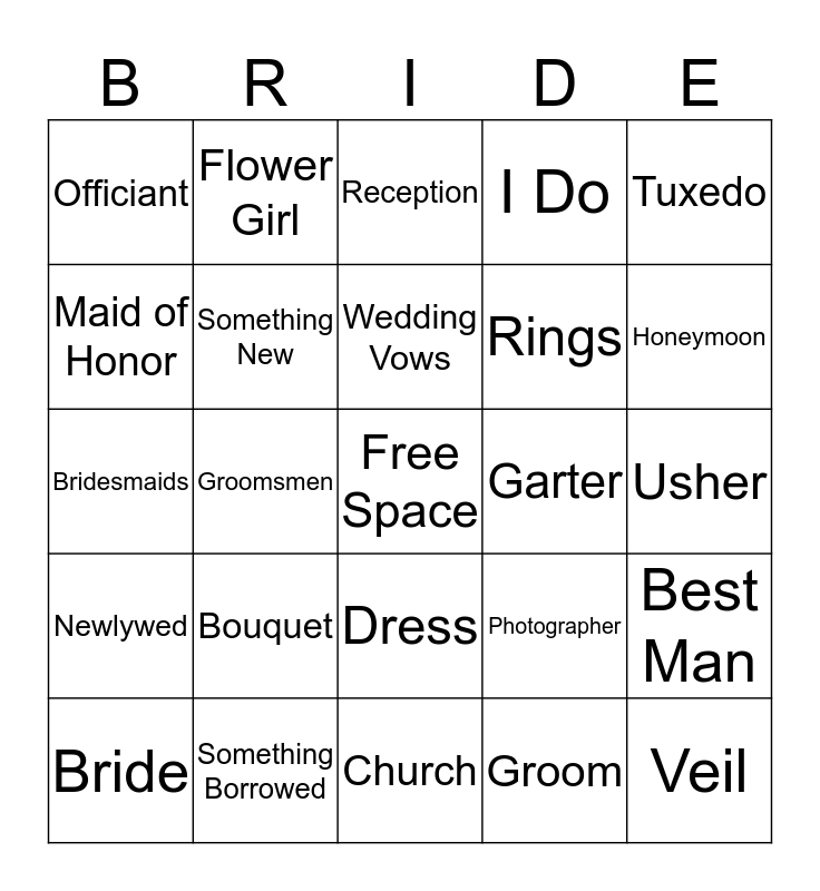 This bingo card has a free space and 24 words: Bouquet, Something Borrowed, Wedding Vows, Bride, Tuxedo, Officiant, Maid of Honor, Flower Girl, Garter, Dress, Rings, Bridesmaids, Photographer, Best Man, Something New, Groom, Usher, Reception, Honeymoon, Groomsmen, Veil, Newlywed, I Do and Church.