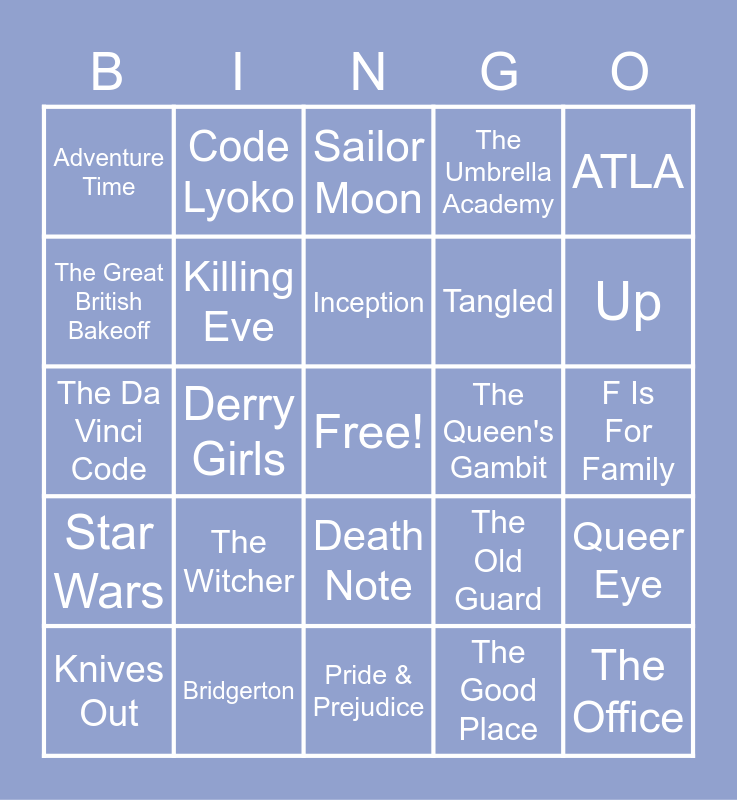 This bingo card has a free space and 24 words: The Witcher, Bridgerton, Inception, Knives Out, ATLA, Adventure Time, The Great British Bakeoff, Code Lyoko, The Queen's Gambit, Death Note, Tangled, The Da Vinci Code, The Old Guard, Queer Eye, Killing Eve, The Good Place, F Is For Family, Sailor Moon, Up, Derry Girls, The Office, Star Wars, The Umbrella Academy and Pride & Prejudice.