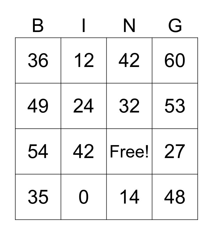 This bingo card has 22 words: 0, 6, 12, 18, 24, 32, 36, 42, Free!, 48, 54, 60, 0, 7, 14, 21, 27, 35, 42, 49, 53 and 70.