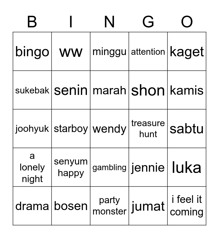 This bingo card has a free space and 24 words: senyum happy, bosen, marah, drama, kaget, bingo, sukebak, ww, treasure hunt, gambling, shon, joohyuk, jennie, luka, senin, jumat, sabtu, minggu, kamis, starboy, i feel it coming, a lonely night, attention and party monster.