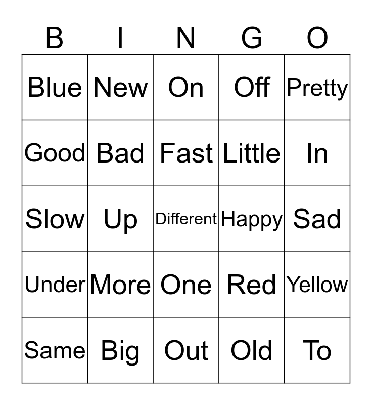 This bingo card has a free space and 24 words: More, Big, Fast, Same, Pretty, Blue, Good, New, Happy, One, Little, Slow, Red, Yellow, Bad, Old, Sad, On, In, Up, To, Under, Off and Out.