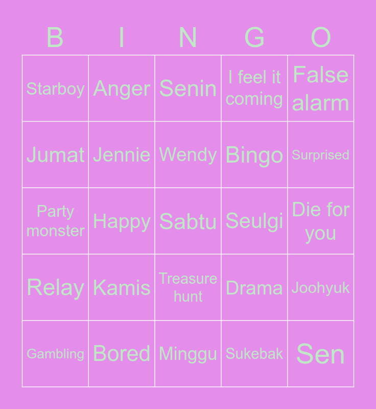 This bingo card has a free space and 24 words: Kamis, Bored, Wendy, Gambling, False alarm, Starboy, Jumat, Anger, Seulgi, Treasure hunt, Bingo, Party monster, Drama, Joohyuk, Jennie, Sukebak, Die for you, Senin, Surprised, Happy, Sen, Relay, I feel it coming and Minggu.