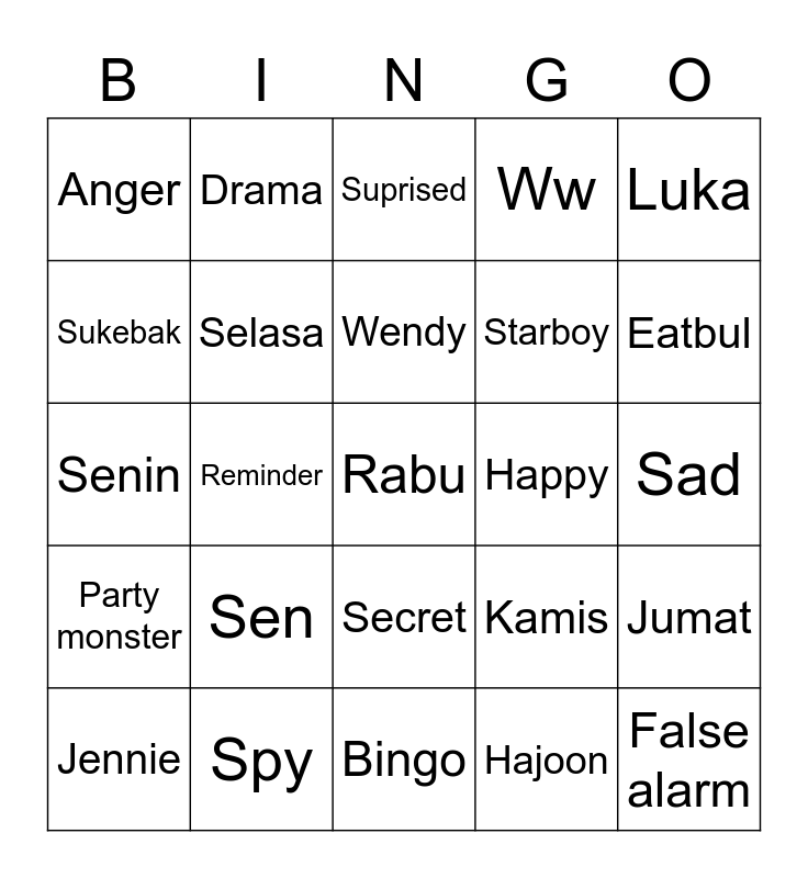 This bingo card has a free space and 24 words: Jennie, Sen, Wendy, Hajoon, Luka, Anger, Drama, Suprised, Happy, Sad, Senin, Selasa, Kamis, Jumat, Sukebak, Spy, Bingo, Ww, Eatbul, Party monster, Reminder, Secret, Starboy and False alarm.