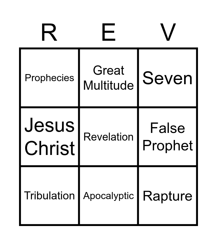 This bingo card has 15 words: Patmos, John The Apostle, Seven, Prophecies, Apocalyptic, Revelation, The Four Horsemen, Judgement Day, False Prophet, Rapture, Satan, Jesus Christ, Tribulation, Great Multitude and Millennium.