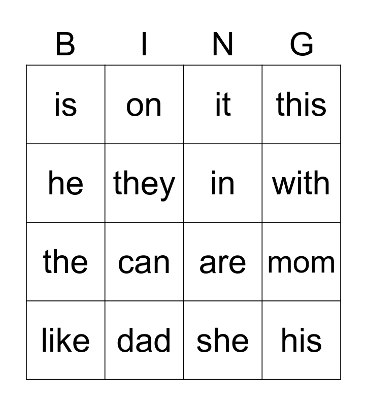 This bingo card has 16 words: dad, mom, it, is, the, on, are, she, he, they, like, this, can, with, in and his.