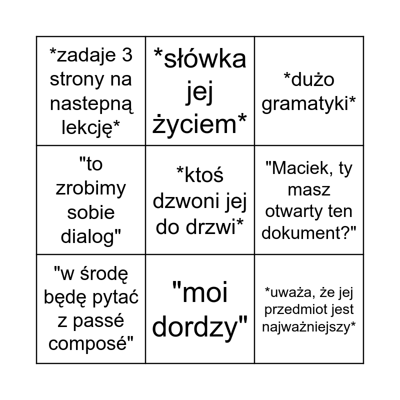 This bingo card has a free space and 8 words: "Maciek, ty masz otwarty ten dokument?", *dużo gramatyki*, *słówka jej życiem*, "w środę będę pytać z passé composé", *zadaje 3 strony na nastepną lekcję*, *uważa, że jej przedmiot jest najważniejszy*, "to zrobimy sobie dialog" and "moi dordzy".