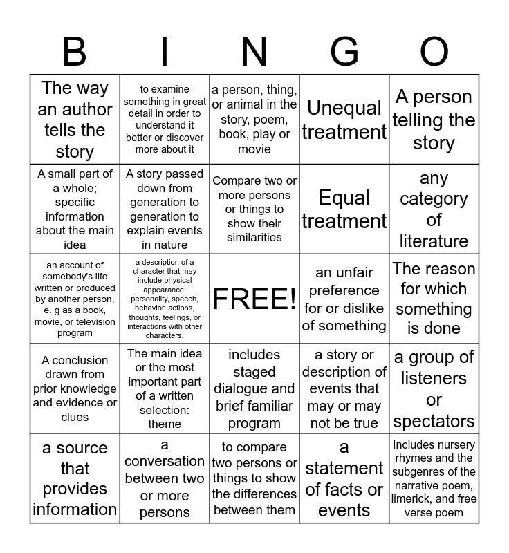This bingo card has a free space and 24 words: The main idea or the most important part of a written selection: theme, a conversation between two or more persons, Compare two or more persons or things to show their similarities, a source that provides information, A person telling the story, The way an author tells the story, A small part of a whole; specific information about the main idea, to examine something in great detail in order to understand it better or discover more about it, an unfair preference for or dislike of something, includes staged dialogue and brief familiar program, Equal treatment, an account of somebody's life written or produced by another person, e. g as a book, movie, or television program, a story or description of events that may or may not be true, a group of listeners or spectators, A story passed down from generation to generation to explain events in nature, a statement of facts or events, The reason for which something is done, a person, thing, or animal in the story, poem, book, play or movie, any category of literature, a description of a character that may include physical appearance, personality, speech, behavior, actions, thoughts, feelings, or interactions with other characters., Includes nursery rhymes and the subgenres of the narrative poem, limerick, and free verse poem, A conclusion drawn from prior knowledge and evidence or clues, Unequal treatment and to compare two persons or things to show the differences between them.