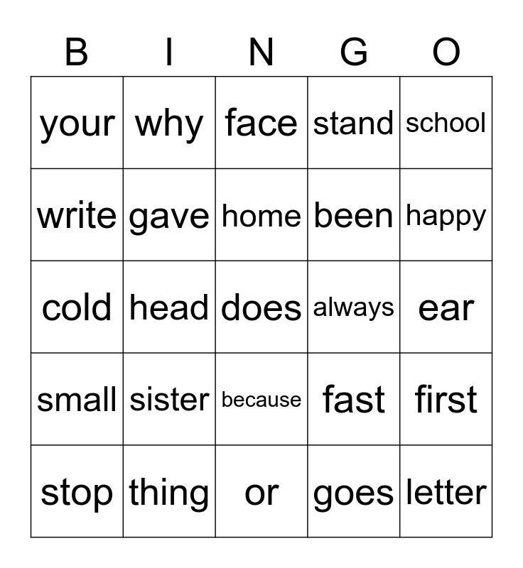 This bingo card has a free space and 24 words: sister, thing, home, stop, school, your, write, why, always, because, been, cold, fast, first, gave, goes, ear, face, happy, head, letter, small, stand and or.