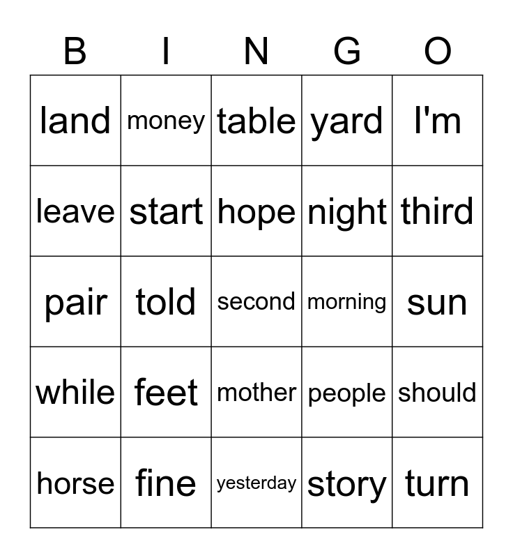 This bingo card has a free space and 24 words: feet, fine, hope, horse, I'm, land, leave, money, morning, mother, night, pair, people, should, start, story, sun, table, third, told, turn, while, yard and yesterday.