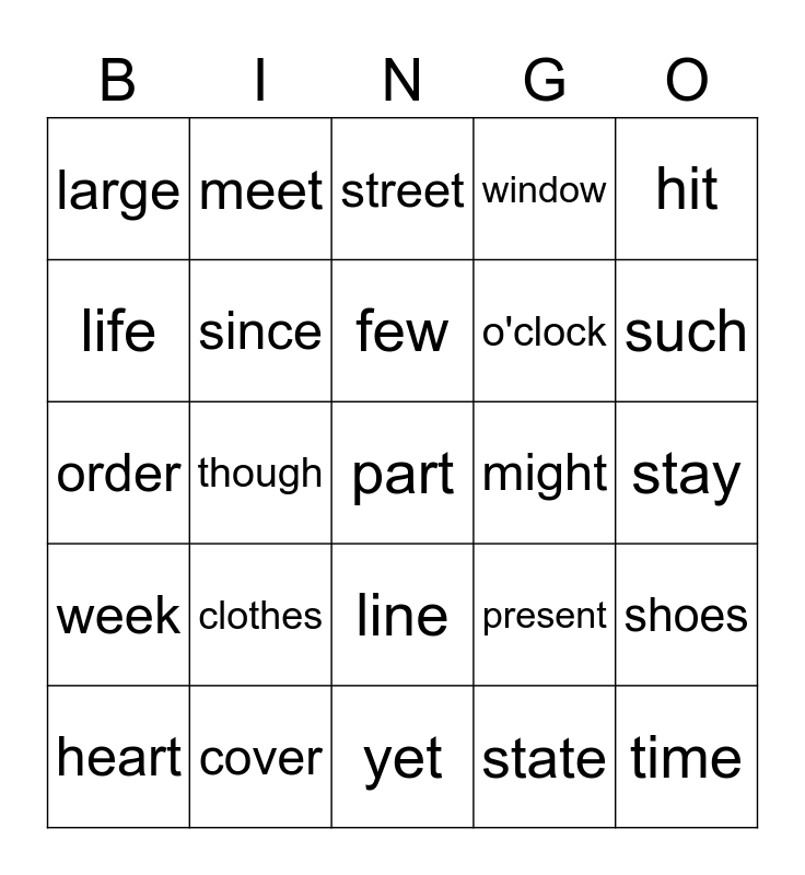 This bingo card has a free space and 24 words: clothes, cover, few, heart, hit, large, life, meet, might, line, o'clock, order, present, shoes, since, state, stay, street, such, though, time, week, window and yet.