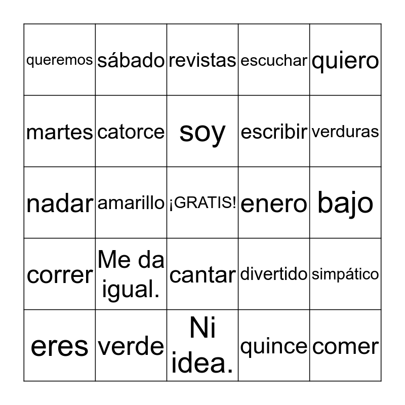 This bingo card has a free space and 24 words: Me da igual., verde, soy, eres, quiero, queremos, martes, sábado, enero, cantar, escribir, nadar, divertido, simpático, catorce, quince, bajo, revistas, verduras, amarillo, comer, correr, escuchar and Ni idea..
