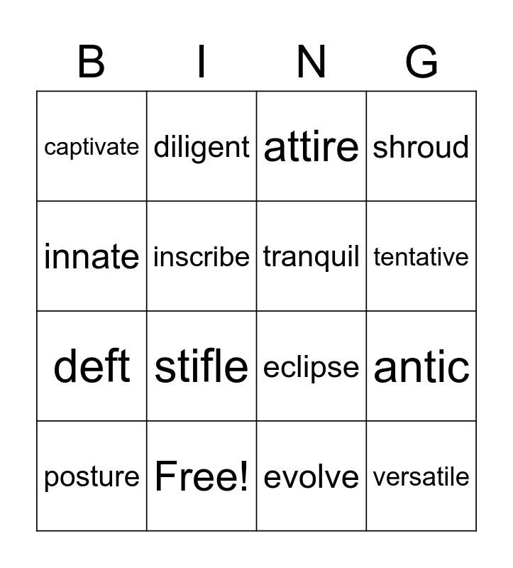 This bingo card has 16 words: Free!, antic, attire, captivate, deft, diligent, eclipse, evolve, innate, inscribe, posture, shroud, stifle, tentative, tranquil and versatile.