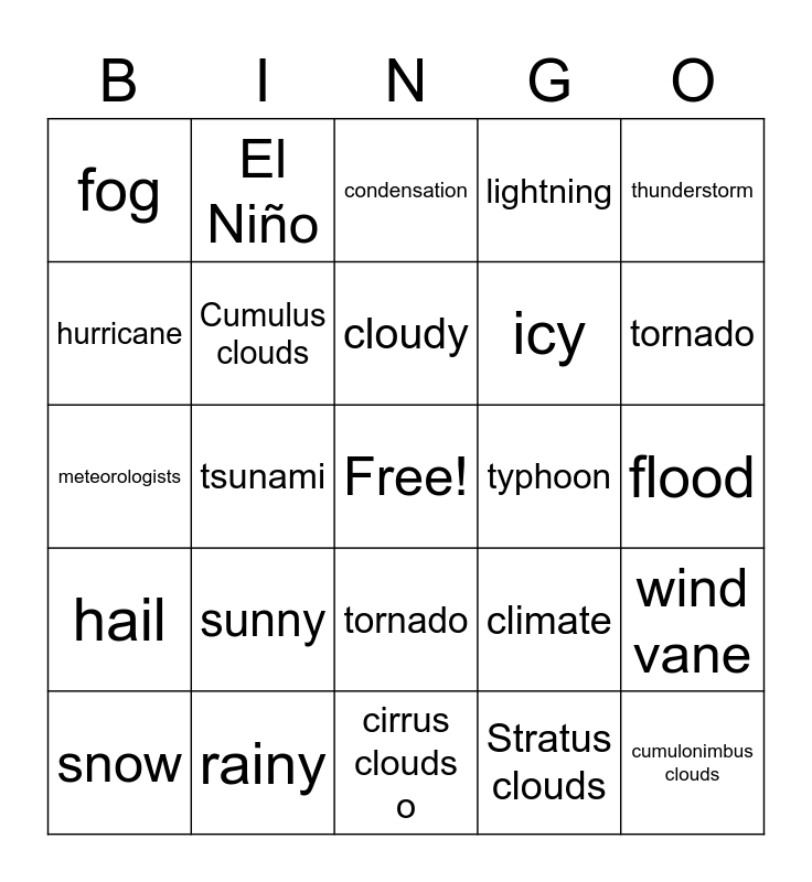 This bingo card has a free space and 24 words: sunny, rainy, cloudy, snow, thunderstorm, fog, hurricane, El Niño, typhoon, tornado, icy, meteorologists, climate, wind vane, Cumulus clouds, Stratus clouds, flood, condensation, tornado, tsunami, cumulonimbus clouds, hail, lightning and cirrus clouds o.