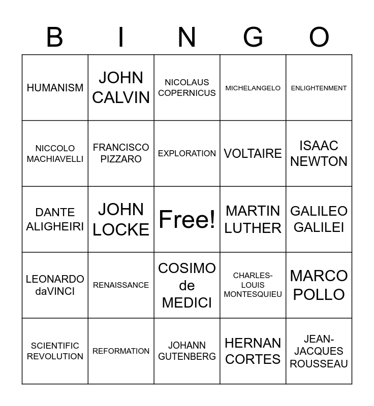 This bingo card has a free space and 24 words: RENAISSANCE, REFORMATION, EXPLORATION, SCIENTIFIC REVOLUTION, ENLIGHTENMENT, HUMANISM, NICCOLO MACHIAVELLI, JOHN CALVIN, MARTIN LUTHER, COSIMO de MEDICI, VOLTAIRE, DANTE ALIGHEIRI, CHARLES-LOUIS MONTESQUIEU, MARCO POLLO, FRANCISCO PIZZARO, HERNAN CORTES, GALILEO GALILEI, NICOLAUS COPERNICUS, ISAAC NEWTON, JOHN LOCKE, JEAN-JACQUES ROUSSEAU, LEONARDO daVINCI, MICHELANGELO and JOHANN GUTENBERG.