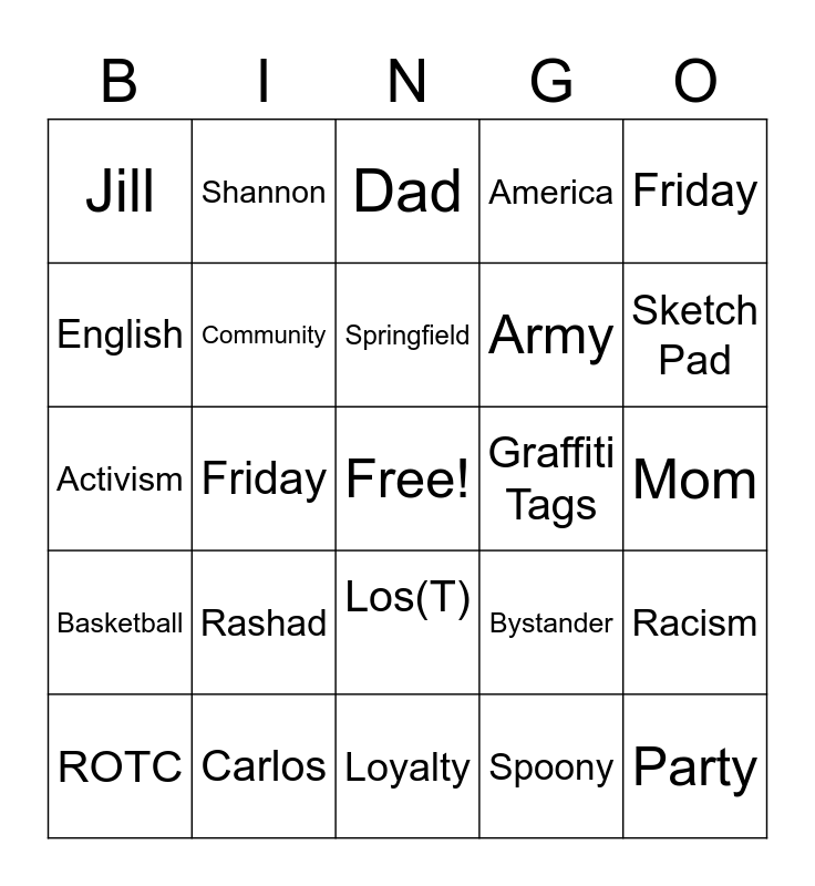 This bingo card has a free space and 24 words: Rashad, Carlos, Springfield, ROTC, Friday, Jill, English, Shannon, Graffiti Tags, Los(T), Army, Activism, Bystander, Racism, Community, Spoony, Mom, Dad, Sketch Pad, Friday, Party, Basketball, America and Loyalty.