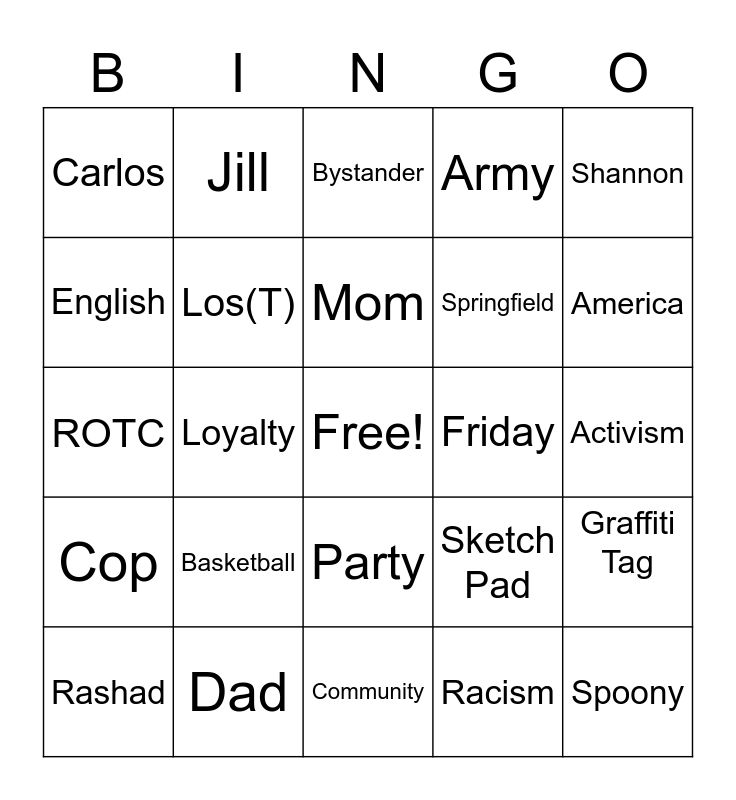 This bingo card has a free space and 24 words: Basketball, Dad, Mom, Rashad, Shannon, Carlos, English, Jill, Friday, Party, Springfield, ROTC, Sketch Pad, Graffiti Tag, Los(T), Racism, Activism, Bystander, America, Loyalty, Spoony, Cop, Army and Community.
