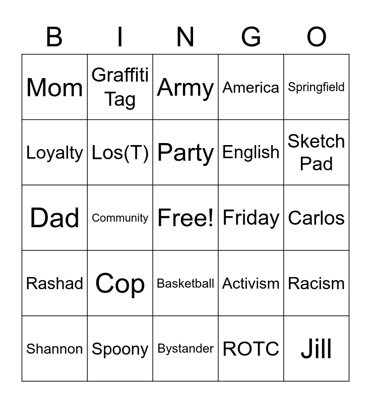 This bingo card has a free space and 24 words: Cop, Spoony, Party, Shannon, Springfield, Mom, Loyalty, Graffiti Tag, Friday, Basketball, English, Dad, Activism, Racism, Los(T), ROTC, Carlos, Army, Sketch Pad, Community, Jill, Rashad, America and Bystander.