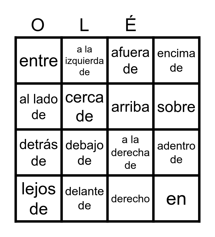 This bingo card has 16 words: delante de, adentro de, afuera de, entre, detrás de, a la izquierda de, a la derecha de, derecho, al lado de, cerca de, lejos de, encima de, debajo de, sobre, arriba and en.