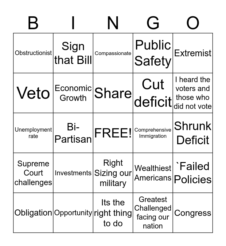 This bingo card has a free space and 24 words: Investments, Opportunity, Share, Obligation, Extremist, Obstructionist, Veto, Sign that Bill, Comprehensive Immigration, Right Sizing our military, Cut deficit, Unemployment rate, Wealthiest Americans, `Failed Policies, Economic Growth, Greatest Challenged facing our nation, Shrunk Deficit, Compassionate, I heard the voters and those who did not vote, Bi-Partisan, Congress, Supreme Court challenges, Public Safety and Its the right thing to do.