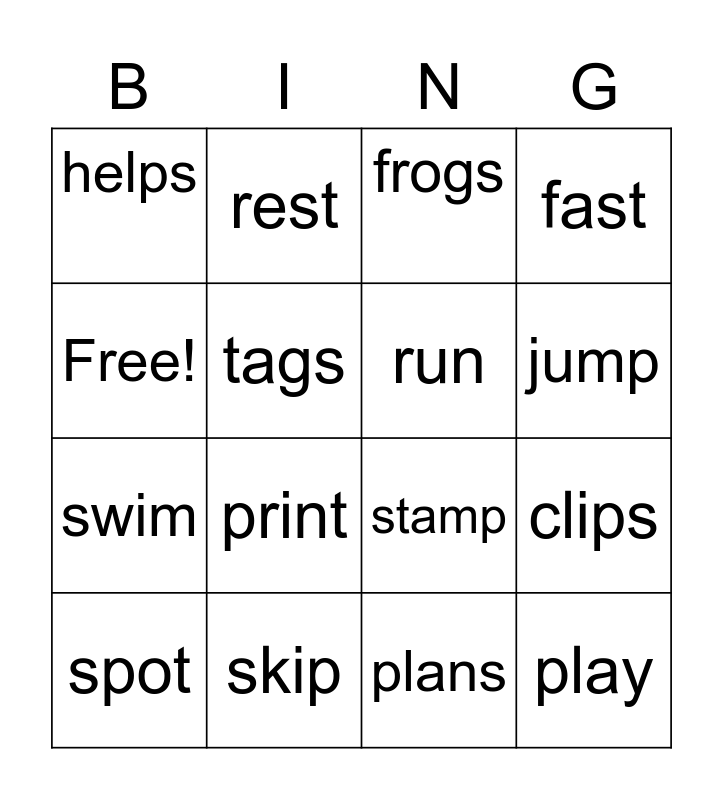 This bingo card has 16 words: skip, clips, frogs, helps, swim, rest, stamp, plans, Free!, tags, spot, fast, print, jump, run and play.
