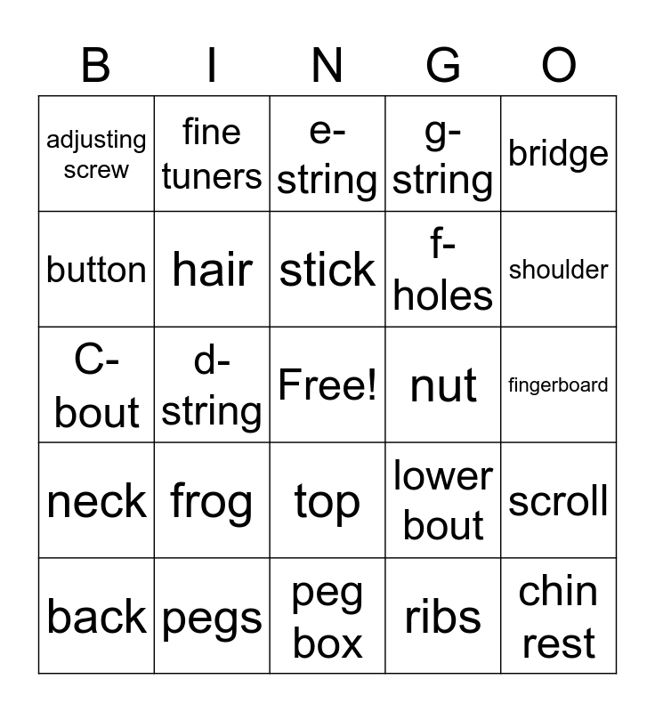 This bingo card has a free space and 28 words: scroll, A-string, f-holes, ribs, button, e-string, fine tuners, neck, nut, back, C-bout, g-string, pegs, peg box, shoulder, tip, frog, hair, stick, top, adjusting screw, tailpiece, chin rest, d-string, fingerboard, lower bout, bridge and winding.
