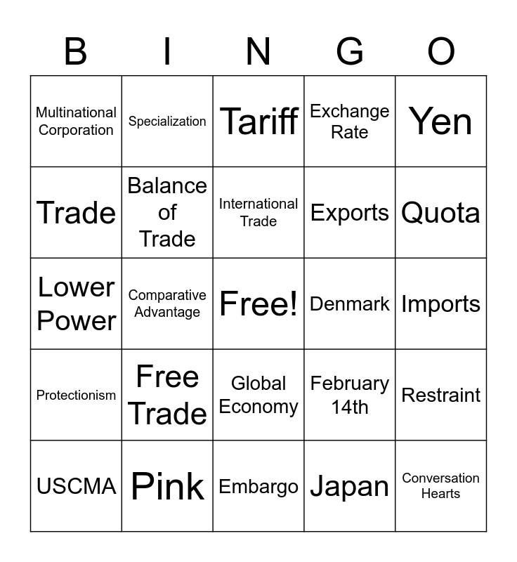 This bingo card has a free space and 26 words: Global Economy, Japan, International Trade, Pink, Yen, Multinational Corporation, Trade, Specialization, Imports, February 14th, Exports, Lower Power, Restraint, USCMA, Comparative Advantage, Individualism, Exchange Rate, Protectionism, Tariff, Conversation Hearts, Quota, Embargo, Denmark, Free Trade, Balance of Trade and Masculinity.