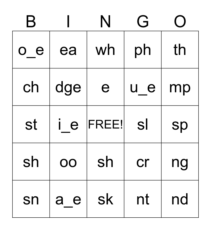 This bingo card has a free space and 24 words: oo, a_e, e, sn, th, o_e, ch, ea, sl, sh, u_e, st, cr, ng, dge, nt, sp, wh, mp, i_e, nd, sh, ph and sk.