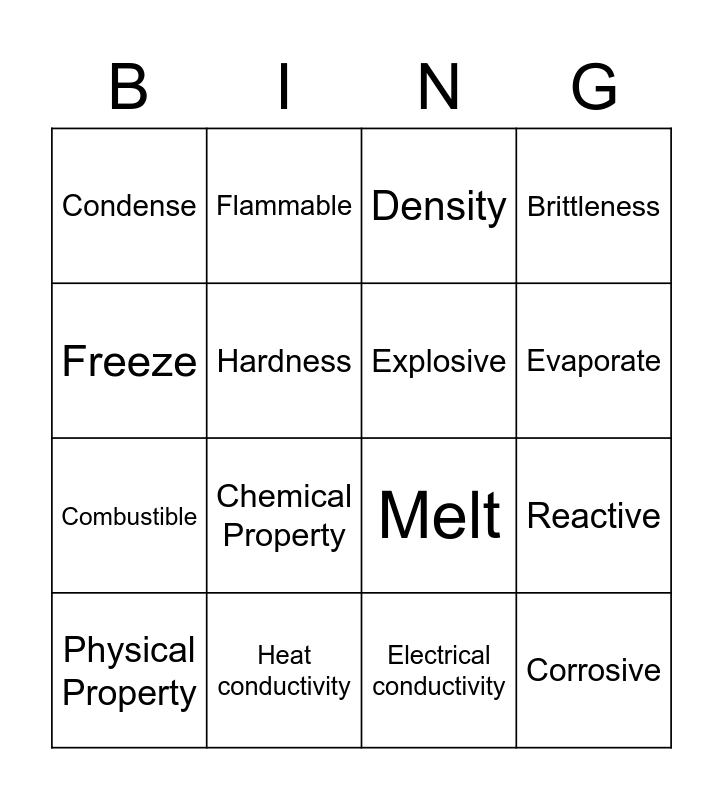 This bingo card has 18 words: Chemical Property, Corrosive, Density, Condense, Melt, Brittleness, Physical Property, Flammable, Evaporate, Combustible, Electrical conductivity, Freeze, Reactive, Hardness, Explosive, Elasticity, Heat conductivity and Malleability.