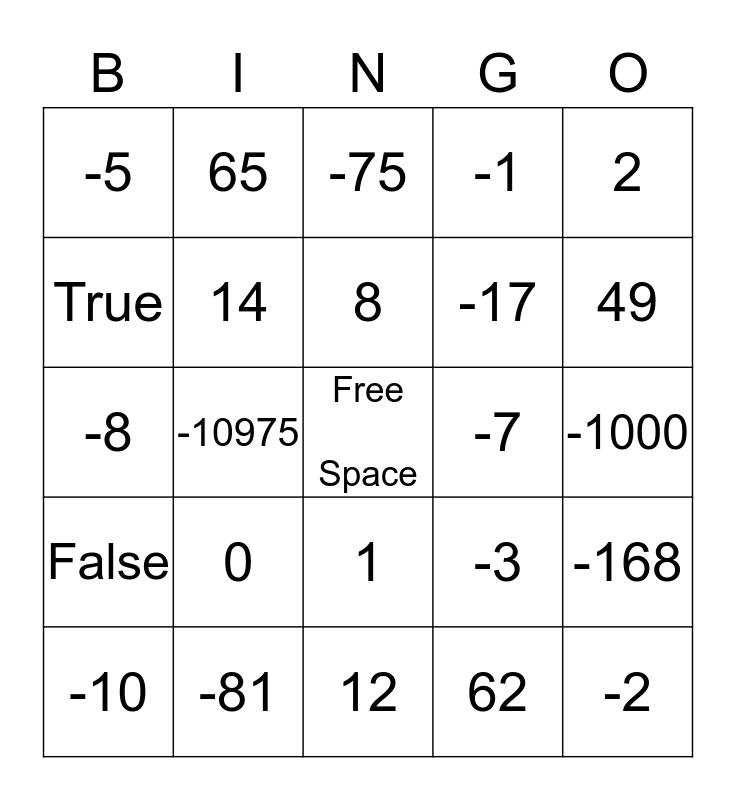 This bingo card has a free space and 24 words: 0, -81, 8, -10, 2, -5, True, 65, -7, 1, -17, -8, -3, -168, 14, 62, -1000, -75, 49, -10975, -2, False, -1 and 12.