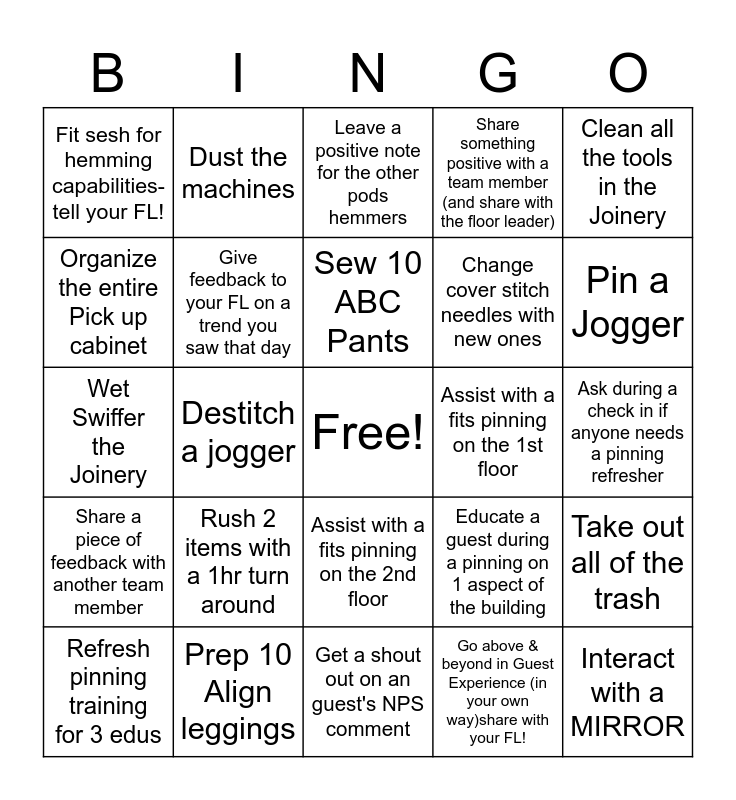 This bingo card has a free space and 24 words: Rush 2 items with a 1hr turn around, Prep 10 Align leggings, Sew 10 ABC Pants, Refresh pinning training for 3 edus, Clean all the tools in the Joinery, Fit sesh for hemming capabilities- tell your FL!, Organize the entire Pick up cabinet, Dust the machines, Assist with a fits pinning on the 1st floor, Assist with a fits pinning on the 2nd floor, Change cover stitch needles with new ones, Wet Swiffer the Joinery, Educate a guest during a pinning on 1 aspect of the building, Take out all of the trash, Give feedback to your FL on a trend you saw that day, Go above & beyond in Guest Experience (in your own way)share with your FL!, Ask during a check in if anyone needs a pinning refresher, Leave a positive note for the other pods hemmers, Pin a Jogger, Destitch a jogger, Interact with a MIRROR, Share a piece of feedback with another team member, Share something positive with a team member (and share with the floor leader) and Get a shout out on an guest's NPS comment.
