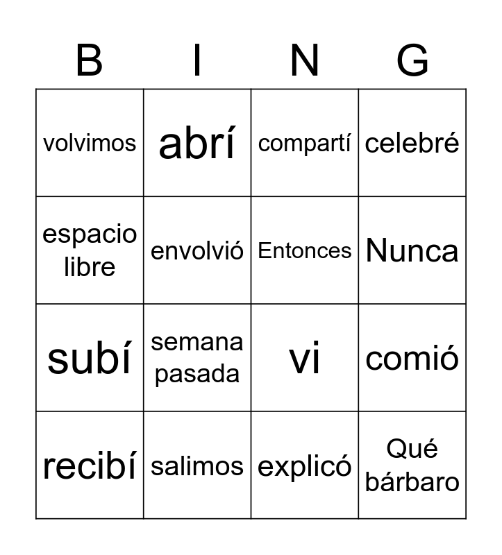 This bingo card has 16 words: salimos, comió, compartí, volvimos, subí, abrí, vi, explicó, espacio libre, envolvió, recibí, celebré, semana pasada, Nunca, Entonces and Qué bárbaro.