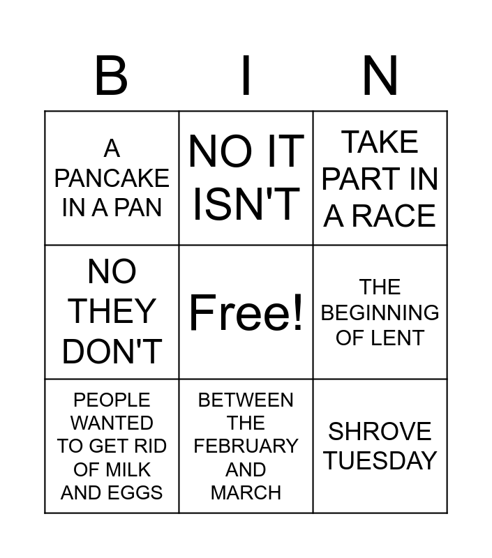 This bingo card has a free space and 10 words: BETWEEN THE FEBRUARY AND MARCH, TAKE PART IN A RACE, A PANCAKE IN A PAN, SHROVE TUESDAY, NO THEY DON'T, PEOPLE WANTED TO GET RID OF MILK AND EGGS, NO IT ISN'T, NO THEY AREN'T, THE BEGINNING OF LENT and THERE'S NO BAKING SODA IN THEM.