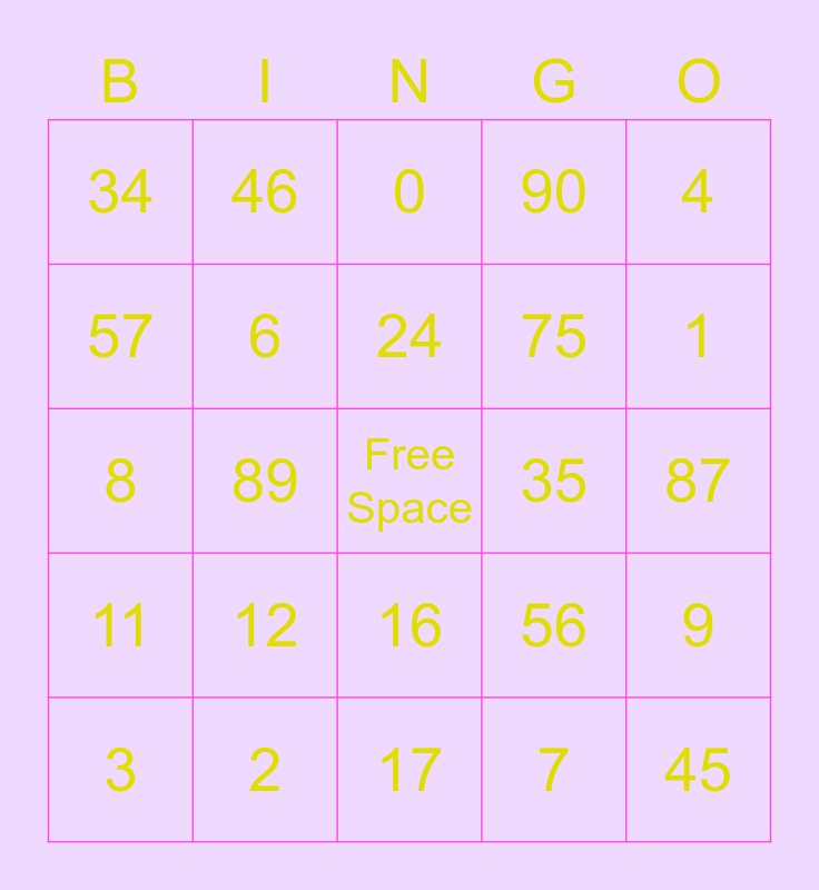 This bingo card has a free space and 24 words: 12, 2, 24, 3, 4, 34, 57, 46, 35, 16, 75, 8, 56, 9, 6, 7, 87, 0, 1, 89, 45, 11, 90 and 17.