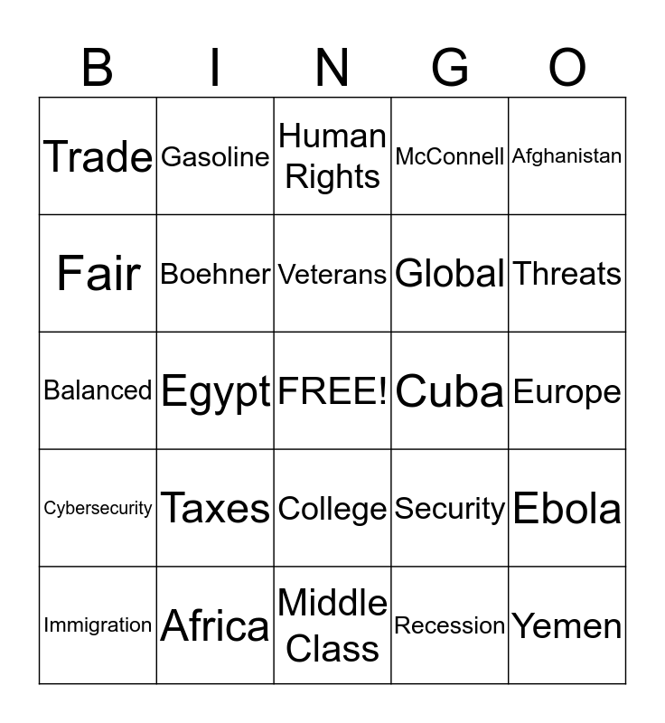 This bingo card has a free space and 47 words: ISIL or ISIS, Yemen, Bipartisan, Middle Class, Taxes, Wealthy, Gasoline, Budget, Fair, Affordable Health Care Act, Boehner, McConnell, Ebola, Security, Iraq, France, Veterans, Cuba, Economy, Afghanistan, Egypt, Recession, Trade, Global, Terrorists, Threats, Immigration, Climate Change, College, Cybersecurity, Hackers, Loopholes, Internet, Community College, Asia, Africa, Europe, China, Keystone, Trade, Sony, Human Rights, Balanced, Congress, Capital Gains, Billion and Wall Street.