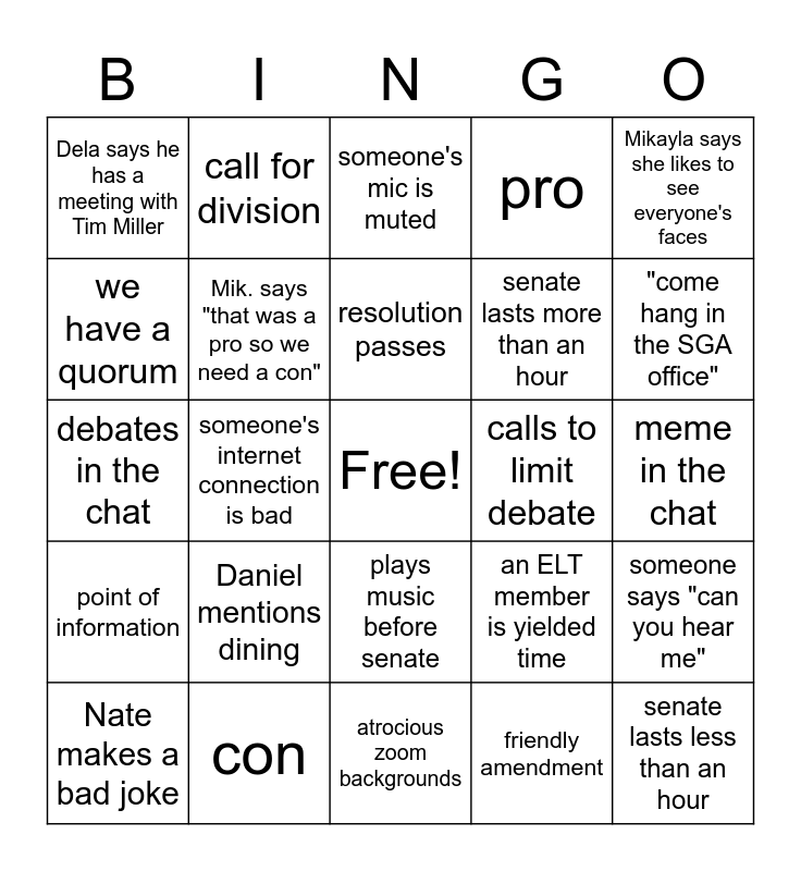This bingo card has a free space and 24 words: Daniel mentions dining, con, resolution passes, Nate makes a bad joke, Mikayla says she likes to see everyone's faces, Dela says he has a meeting with Tim Miller, we have a quorum, call for division, calls to limit debate, plays music before senate, senate lasts more than an hour, debates in the chat, an ELT member is yielded time, someone says "can you hear me", Mik. says "that was a pro so we need a con", friendly amendment, meme in the chat, someone's mic is muted, "come hang in the SGA office", someone's internet connection is bad, senate lasts less than an hour, point of information, pro and atrocious zoom backgrounds.