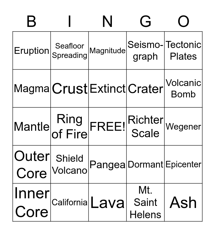 This bingo card has a free space and 24 words: Shield Volcano, California, Extinct, Inner Core, Tectonic Plates, Eruption, Magma, Seafloor Spreading, Richter Scale, Pangea, Crater, Mantle, Dormant, Epicenter, Crust, Mt. Saint Helens, Wegener, Magnitude, Volcanic Bomb, Ring of Fire, Ash, Outer Core, Seismo- graph and Lava.
