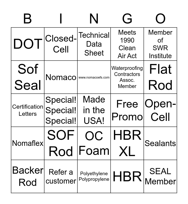 This bingo card has a free space and 24 words: SOF Rod, Refer a customer, www.nomacoefs.com, Backer Rod, Member of SWR Institute, DOT, Sof Seal, Closed-Cell, Free Promo, OC Foam, Waterproofing Contractors Assoc. Member, Certification Letters, HBR XL, Sealants, Nomaco, HBR, Open-Cell, Technical Data Sheet, Flat Rod, Special! Special! Special!, SEAL Member, Nomaflex, Meets 1990 Clean Air Act and Polyethylene Polypropylene.