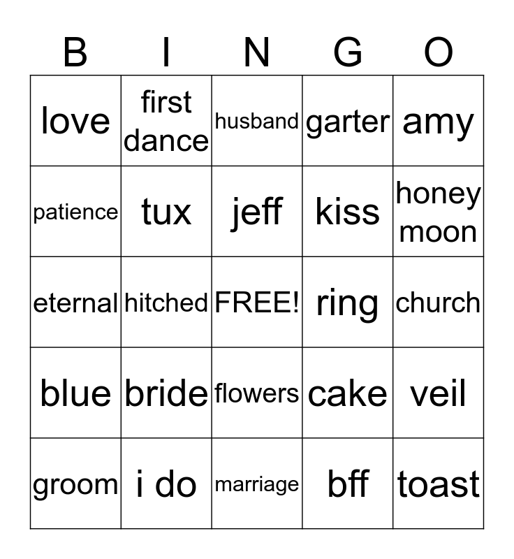 This bingo card has a free space and 24 words: bride, i do, jeff, groom, amy, love, patience, first dance, ring, flowers, kiss, eternal, cake, veil, tux, bff, church, husband, honey moon, hitched, toast, blue, garter and marriage.