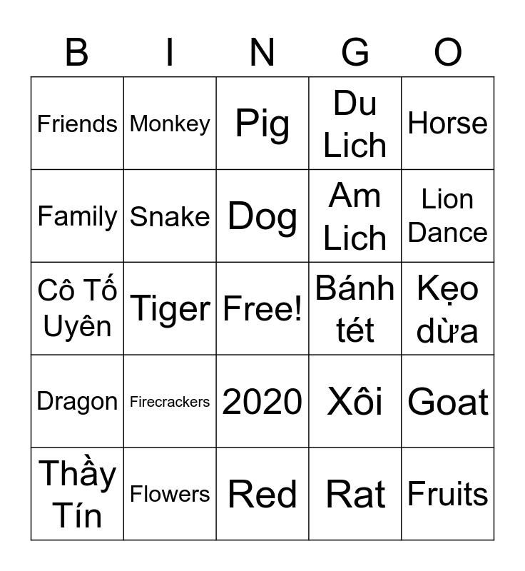 This bingo card has a free space and 32 words: Rat, Ox, Tiger, Cat, Dragon, Snake, Horse, Goat, Monkey, Rooster, Dog, Pig, Li Xi, Bánh chưng, Bánh tét, Áo dài, Thầy Tín, Cô Tố Uyên, 2020, Firecrackers, Xôi, Múa lân, Kẹo dừa, Flowers, Fruits, Du Lich, Am Lich, Family, Friends, Red, Orange and Lion Dance.