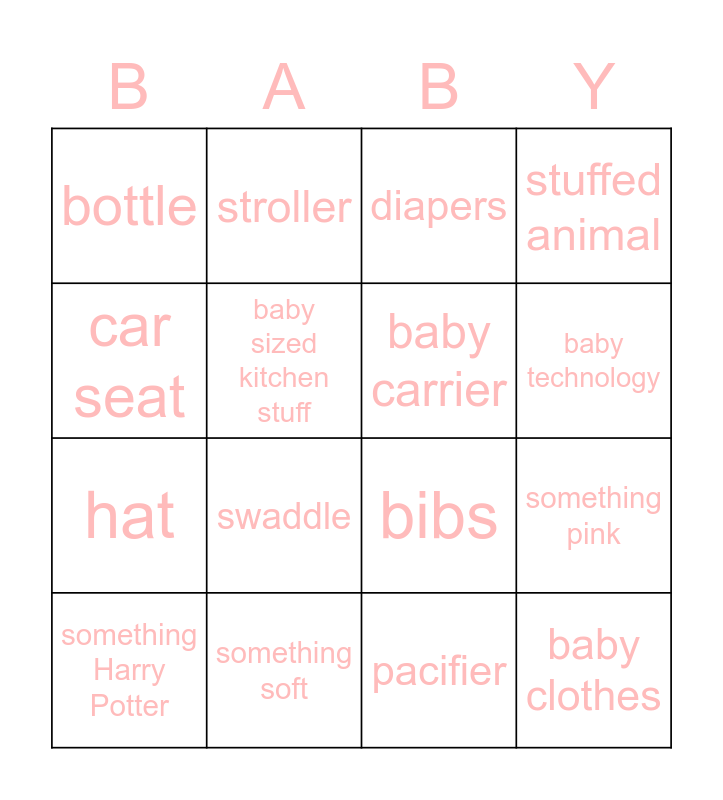 This bingo card has 25 words: baby book, something educational, baby technology, baby wipes, car seat, bottle, baby sized kitchen stuff, stroller, something soft, a monitor, hat, bibs, matching set, nursing gear, baby carrier, baby shoes, pacifier, diapers, swaddle, something pink, something Harry Potter, bath-time things, baby clothes, stuffed animal and blanket.