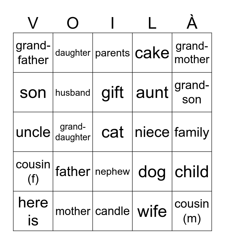 This bingo card has a free space and 24 words: father, mother, gift, here is, grand-mother, grand-father, son, daughter, niece, nephew, aunt, uncle, dog, child, husband, wife, family, parents, grand-son, grand-daughter, cousin (m), cousin (f), cake and candle.